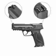 Die M&P9 M2.0 ist mit einem Metall-Schlitten ausgestattet. Das Griffstück besteht aus hochwertigem Kunststoff. Der Griffrücken kann ausgewechselt werden. Im Lieferumfang befindet sich die Größe M. Unter dem Lauf ist eine Picatinny-Schiene integriert zur Montage von taktischem Zubehör. Weitere Merkmale sind ein beidseitiger Schlittenfanghebel und eine Abzugszüngelsicherung. Das Modell ist für Rechts- und Linkshänder nutzbar. Die Blow Back Funktion sorgt für ein realistisches Schusserlebnis. Der Antrieb erfolgt über eine Standard 12 g Co2-Kapsel. Das All-in-One Magazin hat eine Kapazität von 18 Schuss im Kaliber 4,5 mm Stahl BB.