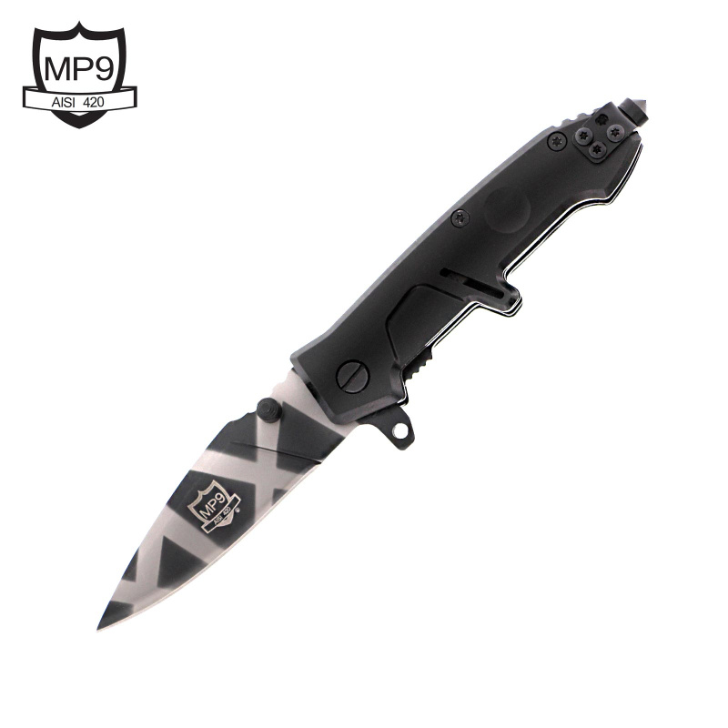 Dieses Einhandmesser ist mit einer zweifarbigen, auffällig gestalteten Klinge aus 420er Stahl versehen. Die Öffnung erfolgt mittels beidseitig montiertem Daumenpin, oder Flipper mit Öse. Zudem verfügt die Klinge über eine Daumenauflage. Die Arretierung erfolgt mittels Liner Lock. Die Griffschalen bestehen aus Aluminium. Hinten ist ein Glasbrecher integriert, was aus dem Messer ein Rettungsmesser macht. Der gelochte Gürtelclip rundet das Modell ab.