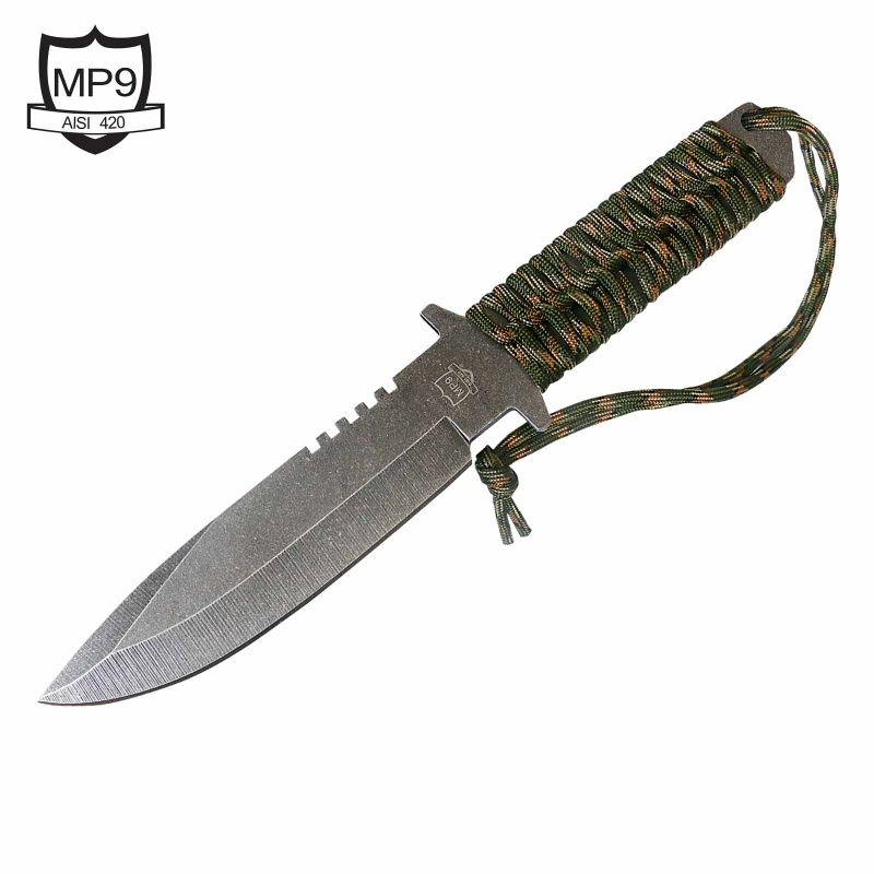 Dieses Messer ist mit einer extra dicken 4 mm Klinge aus 420er Stahl in Stone Wash Optik ausgestattet. Der Griff ist mit Paracord in Digital Camo umwickelt. Zudem ist das Modell mit einem breiten Parierelement ausgestattet, um ein unbeabsichtigtes Abrutschen in die Klinge zu vermeiden. Im Lieferumfang befindet sich ein Nylonetui mit Gürtelschlaufe und Klettverschluss.
