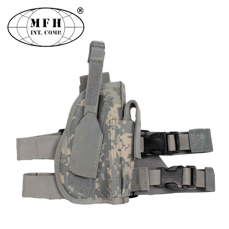 Tiefziehholster für alle gängigen Kurzwaffen, Waffensicherungsriemen mit Klett/Druckknopf verstellbar, Magazintasche mit Klett, höhenverstellbare und abclipbare Gürtelschlaufe, 2 elastische Beingurte verstellbar, 100 % Polyester.